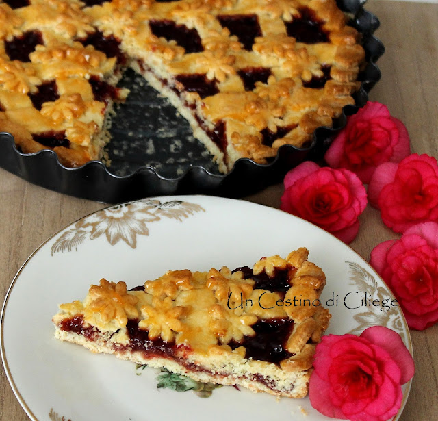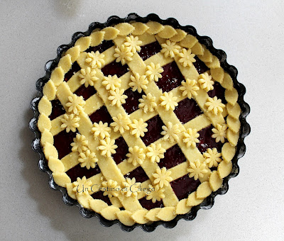 Decorare la crostata con strisce, fiori e foglioline di pasta frolla.