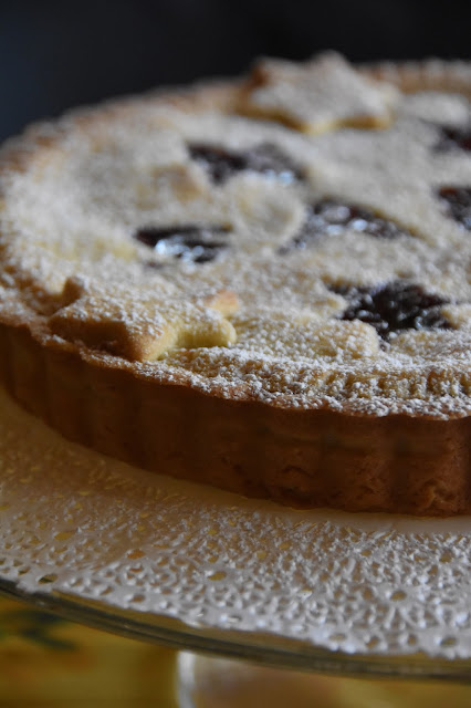 Copriamo con il secondo disco di frolla e facciamo aderire bene i bordi, schiacciando lievemente con i rebbi di una forchetta. Aggiungiamo eventualmente dei decori di frolla (io ho messo 3 stelline di frolla).