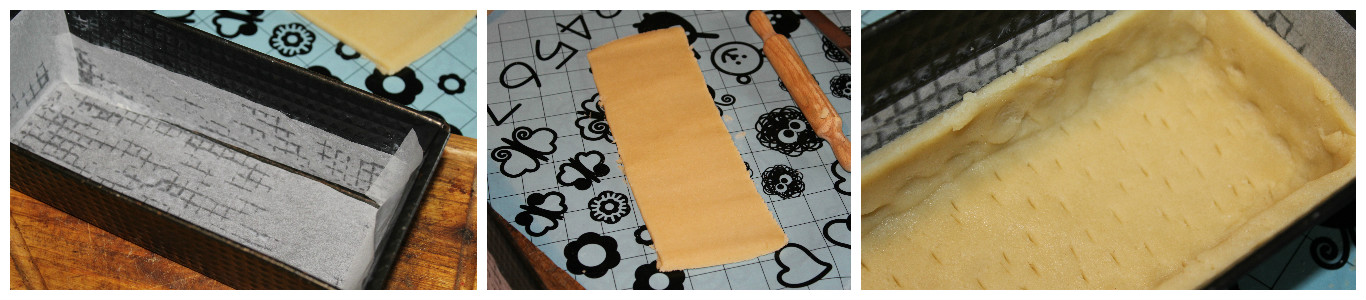 Prendete uno stampo da plumcake in metallo, ungetelo leggermente con del burro, ritagliate dei rettangoli di carta forno grandi a ricoprire il fondo e i lati dell’interno e foderateci lo stampo, il burro servirà per tenere ferma la carta. Stendete la basta di circa un centimetro scarso, usando lo stampo come guida ritagliate un rettangolo per il fondo e 4 strisce per i bordi della crostata. Foderate l’interno dello stampo con i pezzi di pasta e sigillateli tra loro con le dita, forate il fondo con una forchetta.