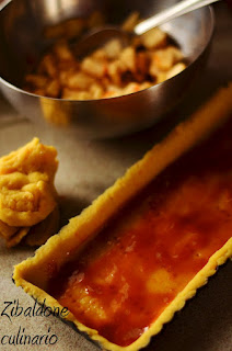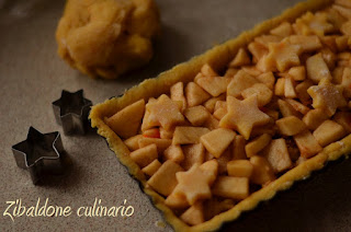 Stenderla con il mattarello dello spessore di circa 2 cm, foderare la teglia dopo aver imburrato, con gli avanzi preparare dei biscottini utili al decoro, che verranno messi in frigo.