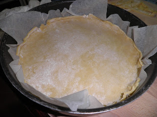 Sistemate il primo disco nella tortiera foderata di carta da forno ( questo ci aiuterà poi a sformarla).