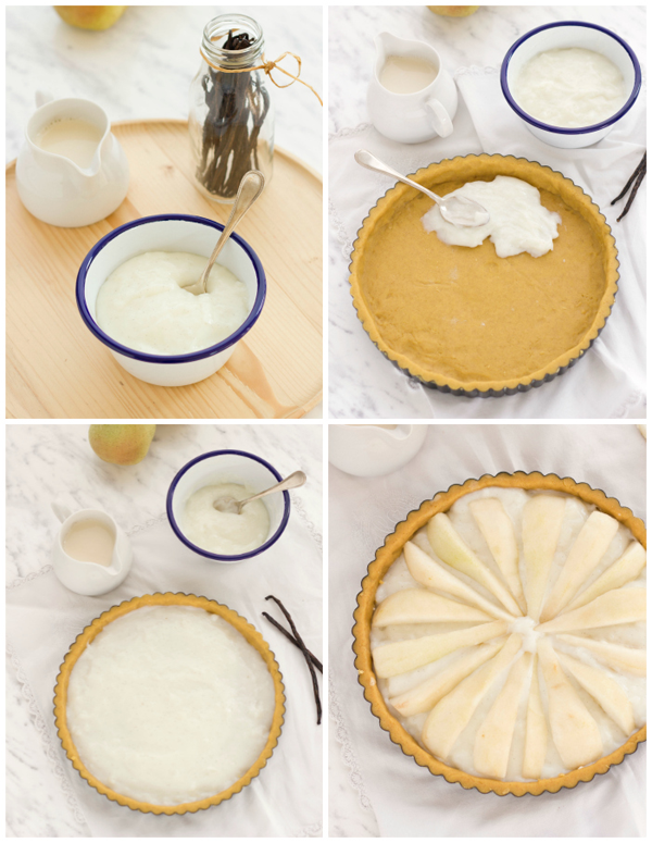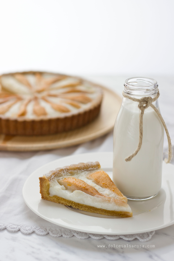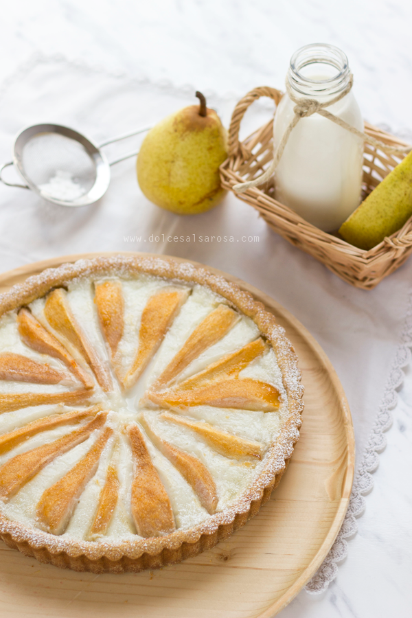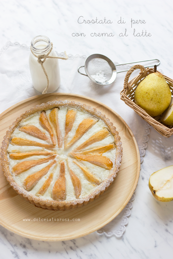 Nel blog trovate diverse crostate, ma mai avevo pensato a questa ripiena di crema al latte (senza uova) e pere.