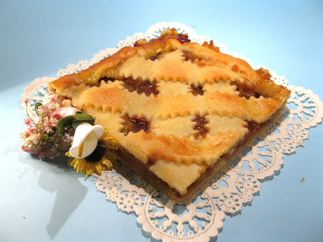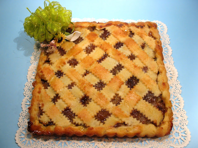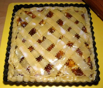 Con gli avanzi di pasta frolla ritagliare delle strisce e formare la grata e pennellare con poco latte..