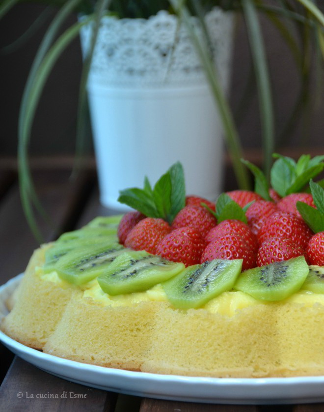 Inserite in una ciotola dai bordi alti le uova, un pizzico di sale e l’olio e con l’aiuto delle fruste elettriche iniziate a montarle fino ad ottenere una consistenza tipo crema, a questo punto sempre frullando aggiungete lo zucchero, poco alla volta, fino ad incorporarlo completamente. Poi, con il semplice ausilio di una frusta a mano, aggiungete la farina setacciata con la fecola ed il lievito. Lavorate bene il composto finché non sarà liscio e omogeneo. Prendete il cosiddetto stampo “furbo” da crostata, cioè uno di quegli stampi con la parte centrale rialzata, imburratelo ed infarinatelo bene, versate il composto, livellatelo, ed infornate in modalità statico a 180° per 18/20 minuti. Una volta sfornato, lasciate raffreddare il dolce nel suo stampo completamente prima di sformarlo. Nel frattempo preparate la crema. In una pentola capiente portate il latte a bollore con le bucce di limone. In un recipiente montate con una frusta a mano i tuorli con lo zucchero fino ad avere un composto chiaro e spumoso, aggiungete la fecola e mescolate bene. Quando il latte avrà appena raggiunto il bollore (appena vedete le primissime bollicine, toglietelo dal fuoco) eliminate la buccia di limone, versate velocemente nel latte il composto di uova e rimettete sul fuoco moderato. Aspettate qualche secondo senza mescolare, appena vedrete apparire in superficie delle bolle di latte che bucano la superficie di tuorlo, iniziate a mescolare velocemente con una frusta, tenendo il fuoco basso, pochi minuti e la crema si addenserà perfettamente. Versatela in una ciotola, copritela con pellicola a contatto e lasciate raffreddare. Appena la crema avrà raggiunto la temperatura giusta sformate il dolce, rigiratelo e versate nell’incavo creato dallo stampo la crema, livellatela e aggiungete la frutta. Ovviamente potrete utilizzare quello che preferite, io ho fatto un giro esterno di fettine di kiwi, ho posizionato al centro le fragole intere ed ho guarnito con qualche fogliolina di menta fresca. Una volta finita di comporre, coprite la torta e mettetela in frigorifero (io per praticità l’ho messa in un porta torte, ma potete anche semplicemente coprirla con della pellicola per alimenti). Tiratela fuori dal frigorifero 30 minuti prima di servirla. Questo dolce si conserva ottimo in frigorifero fino a tre giorni.