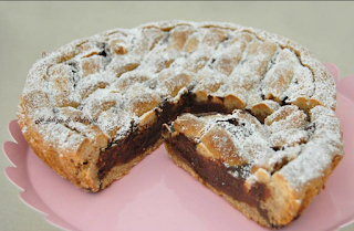 350 g farina 00 50 g farina di nocciola 250 g di burro morbido 4 tuorli 50 g di pasta di nocciola 100 g di zucchero semolato 1 cucchiaio di estratto di vaniglia 1 bustina di lievito 200 g di nutella 100 ml di panna liquida per dolci q.b. zucchero a velo Preparazione: Impastare tutti gli ingredienti (tranne la nutella e la panna) fino ad ottenere un panetto liscio e ben amalgamato. Coprire con pellicola e riporre in frigo per un’oretta. In una terrina porre la nutella ed inserire pian piano la panna (leggermente scaldata) amalgamando con un cucchiaio. Trascorso il tempo di riposo, stendere la frolla (conservarne un pezzo per le losanghe superficiali) e, con essa, rivestire una teglia da 21-22 cm di diametro. Farcire con la nutella, decorare con delle losanghe di frolla ed infornare in preriscaldato ventilato a 170° per 20 minuti. Lasciar raffreddare completamente il dolce prima di sformarlo o la farcia vi risulterà liquida, meglio ancora prepararla il giorno prima del consumo. Allungando la nutella con la panna la farcia rimarrà morbida. Prima di servire spolverizzare di zucchero a velo