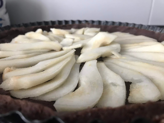 Riprendiamo la frolla, stendiamola e ricopriamo la tortiera. Tagliamo le pere a fettine sottile e adagiamole sopra la frolla.