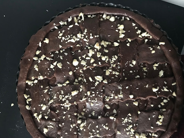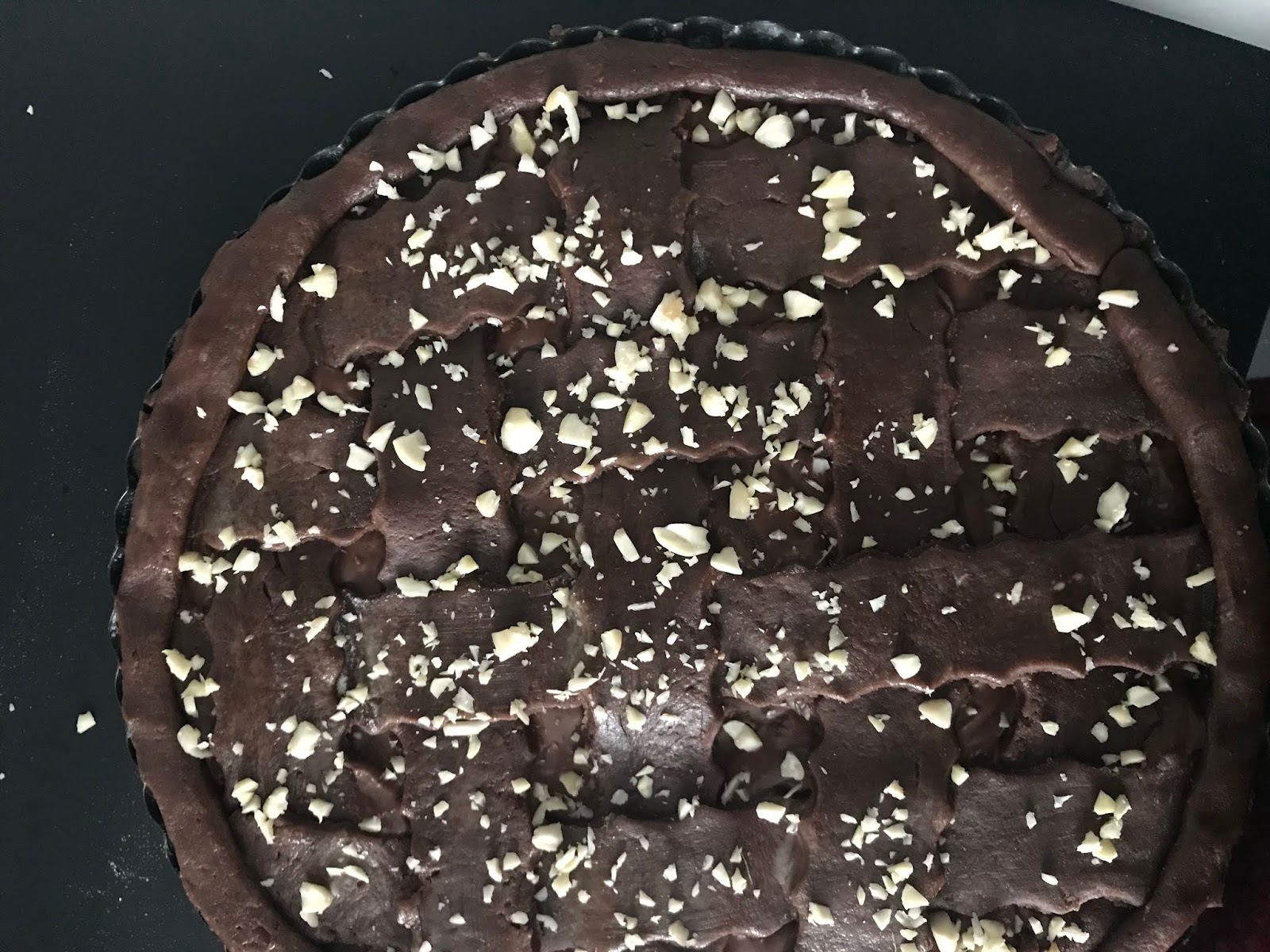 Ricopriamo le pere con il composto al cioccolato e con la frolla rimanente formiamo delle strisce con cui ricopriremo tutta la torta.