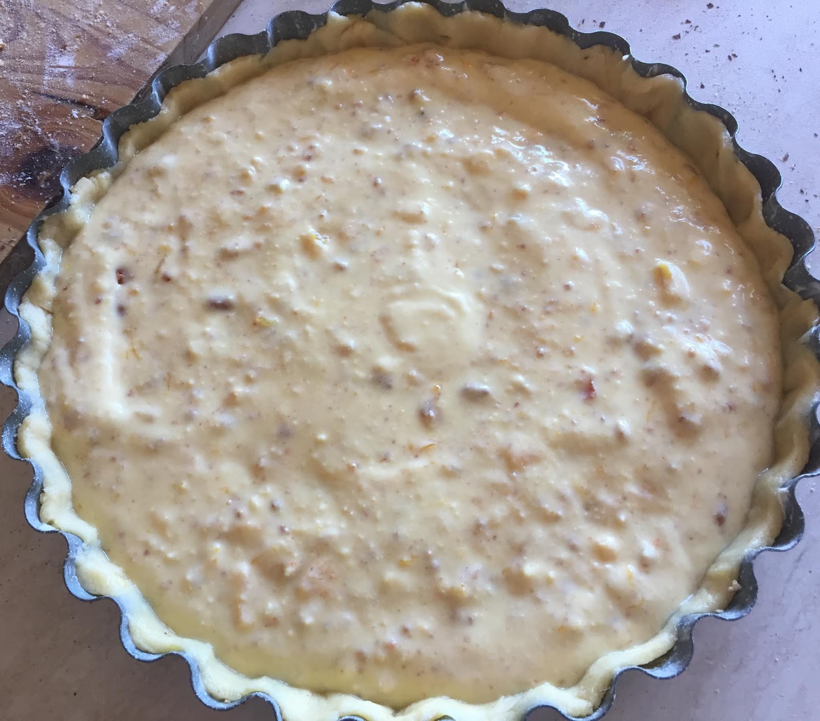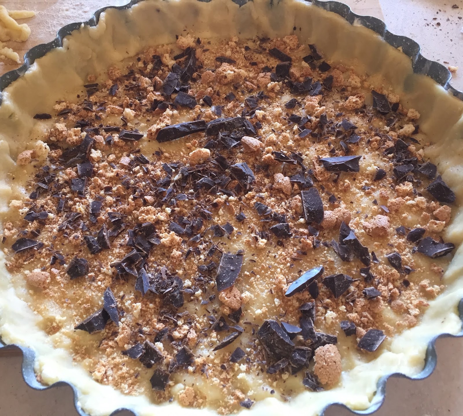 Con una parte della frolla rivestite una tortiera imburrata e infarinata, ricopritela con 3/4 amaretti sbriciolati insieme a scaglie di cioccolato fondente e poi versatevi il ripieno cremoso.