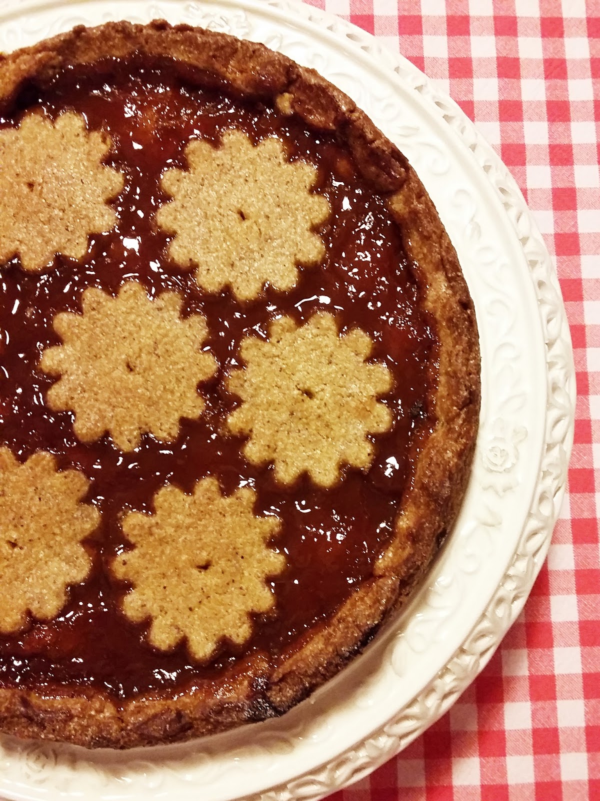 Rifinite i bordi quindi versate la confettura. Sistemate infine le decorazioni tipiche della crostata, che siano strisce di pasta o (come nel mio caso) fiori realizzati con uno stampo per biscotti.