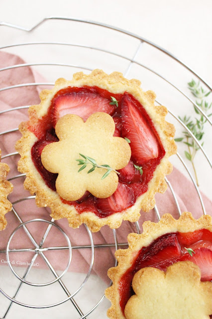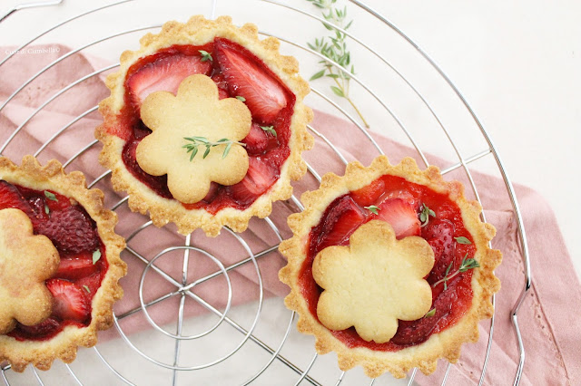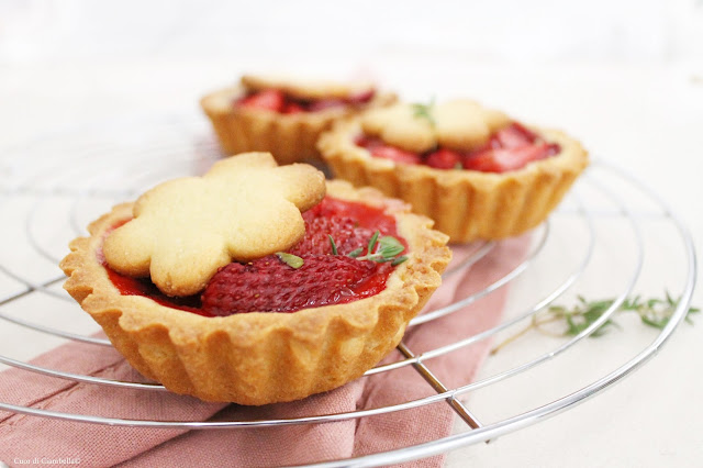 “Siccome le fragole ci piacciono al naturale ho deciso di usare una frolla arricchita da farina di mandorle e di lasciare la frutta così com’è, senza zucchero o altra aggiunta” ed è con questa frase che Marina de La Tarte Maison mi ha conquistato con la sua crostata alle fragole. Così ho seguito la sua ricetta e ne sono saltate fuori delle meravigliose crostatine che ho arricchito post cottura con qualche foglia di timo fresco. Che dire, non ci sono troppe parole per descrivere la croccantezza di una frolla che profuma di mandorle e la magia delle fragole che nel forno si trasformano in confettura, dovete assolutamente provare questa ricetta!