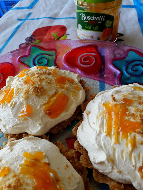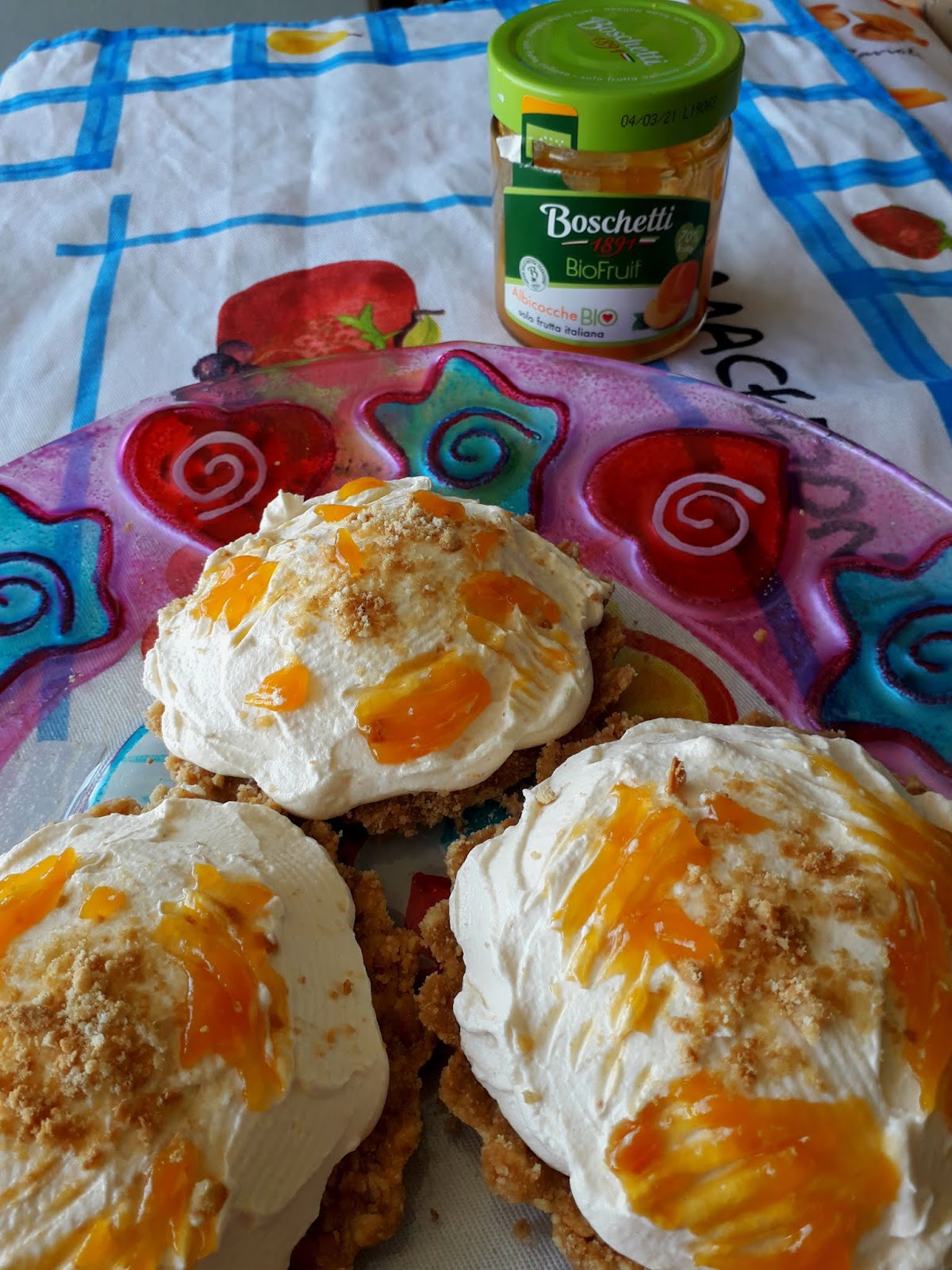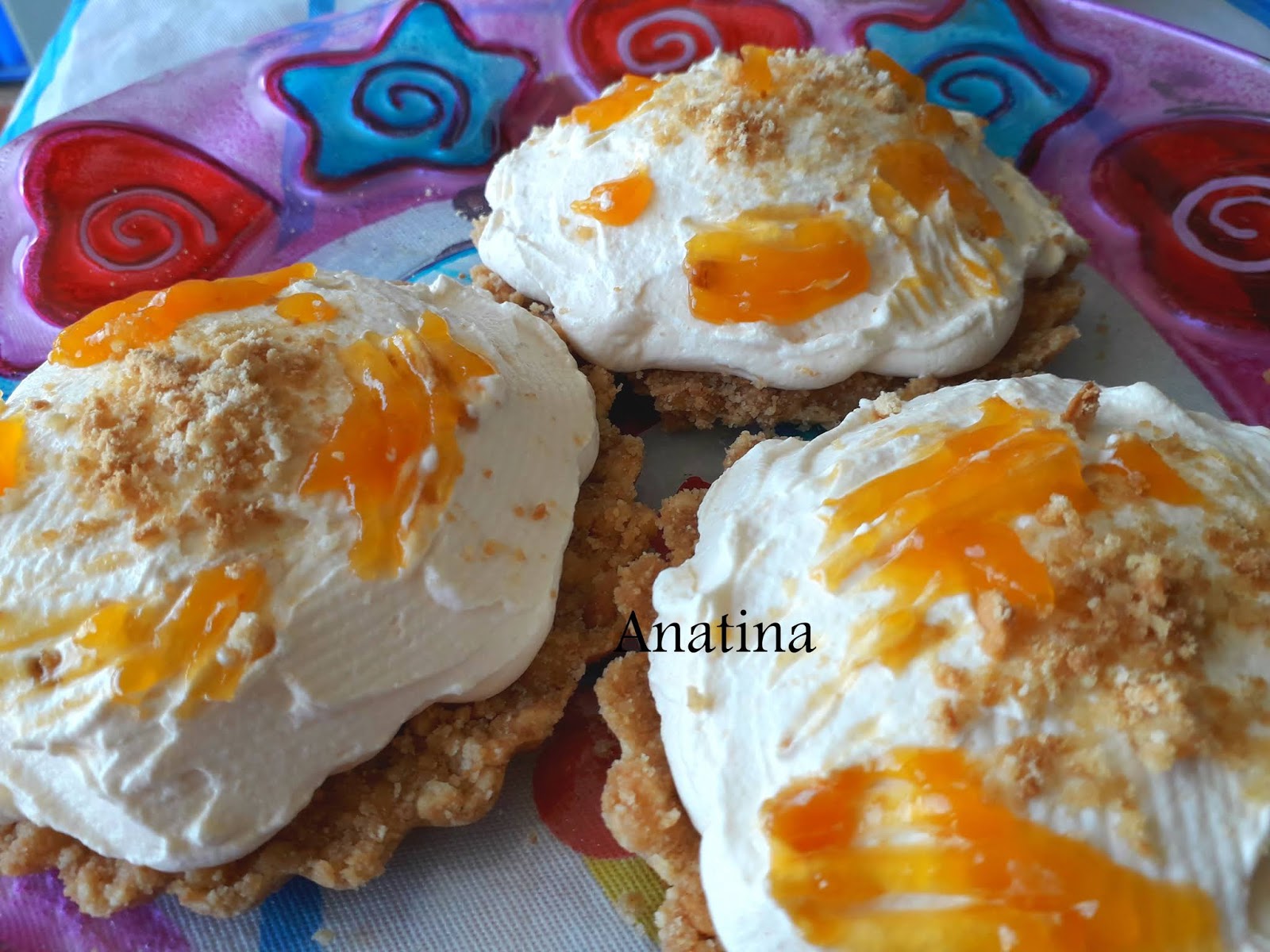 Dividere la crema nelle varie crostatine ,decorare con la restante confettura e il biscotto tritato