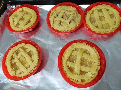 naturalmente potete farcire le crostatine con i gusti che preferite, ci sono tante varietà. Stendere la pasta frolla restante e tagliare le classiche striscioline per ricoprire le crostatine.