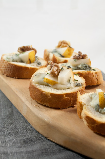 Nel frattempo tagliare la pera a fettine sottili, disporle sul crostino caldo, aggiungere un pezzetto di gorgonzola e i gherigli di noci tritati grossolanamente.