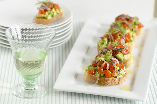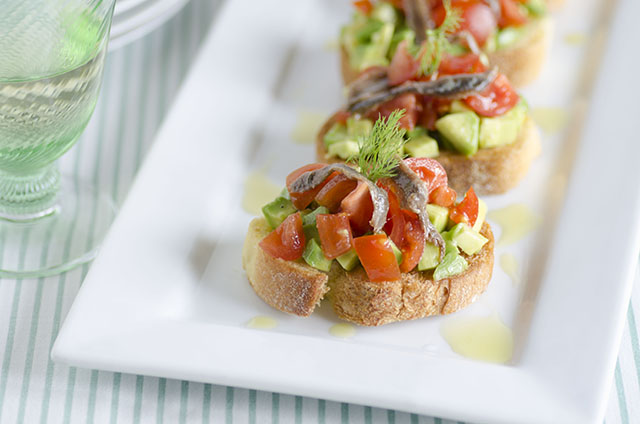 Distribuite l’avocado sui crostini, i pomodorini e completate con 2 filetti di acciuga piccoli oppure uno più grande.