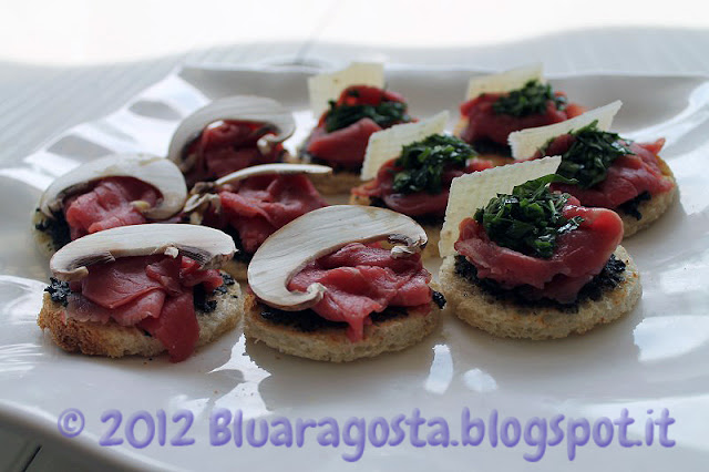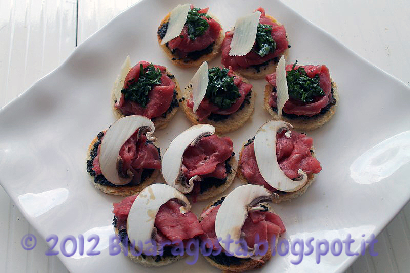 E mentre tornavo a casa in macchina, ho pensato a dei crostini di carpaccio….perché no? Ho deciso di farli in due modi: uno con pane, crema di tartufo, carpaccio e funghi champignon crudi, e l’altro con pane, crema di tartufo, carpaccio, condimento di rucola e una scaglia di parmigiano. Un classicissimo carpaccio ma curato nella presentazione e fatto come un finger food.
