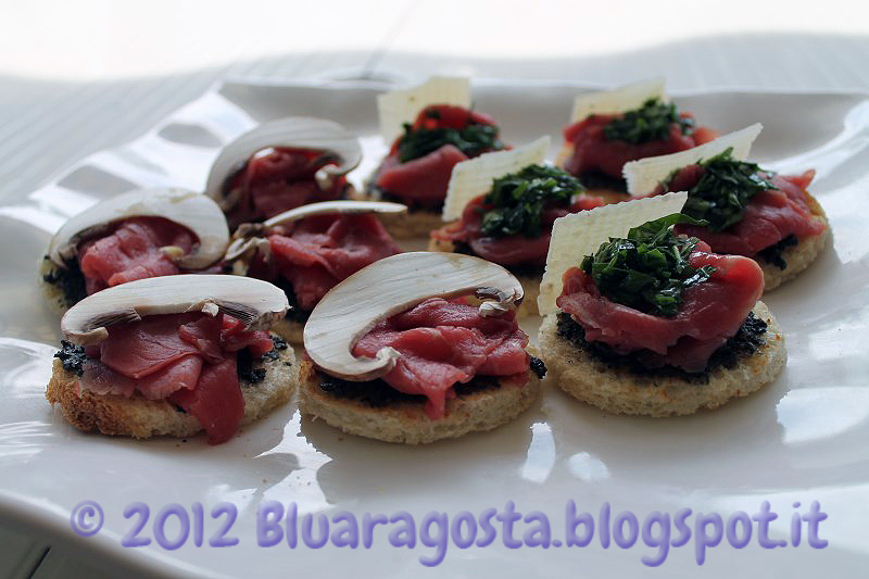 E mentre tornavo a casa in macchina, ho pensato a dei crostini di carpaccio….perché no? Ho deciso di farli in due modi: uno con pane, crema di tartufo, carpaccio e funghi champignon crudi, e l’altro con pane, crema di tartufo, carpaccio, condimento di rucola e una scaglia di parmigiano. Un classicissimo carpaccio ma curato nella presentazione e fatto come un finger food.
