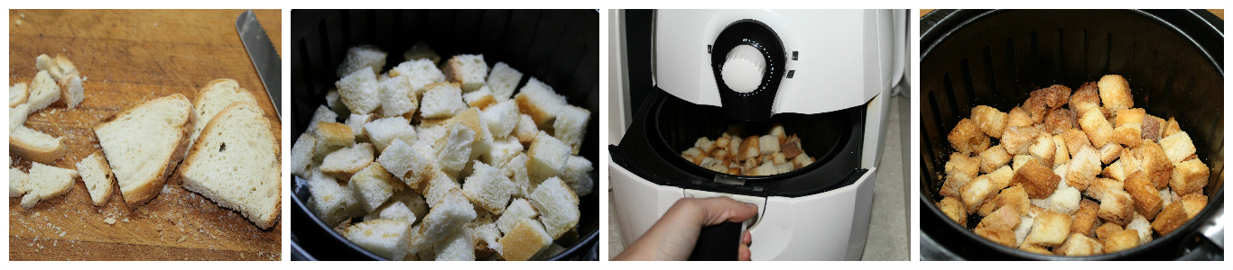 Cuocete a 200° tra i 5 e gli 8 minuti, avendo l’accortezza di scuotere ogni tanto il cestello per girare i cubetti di pane.