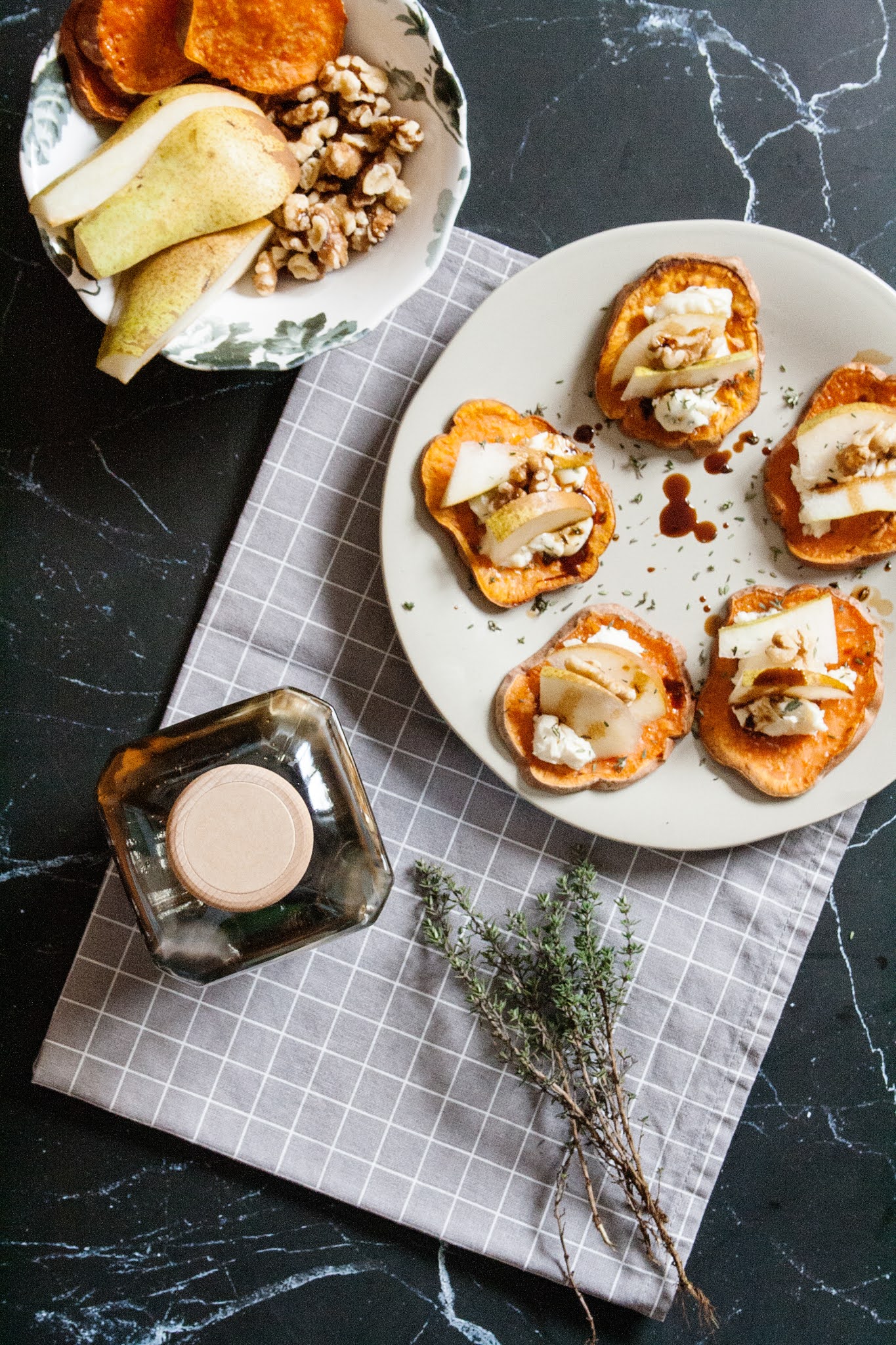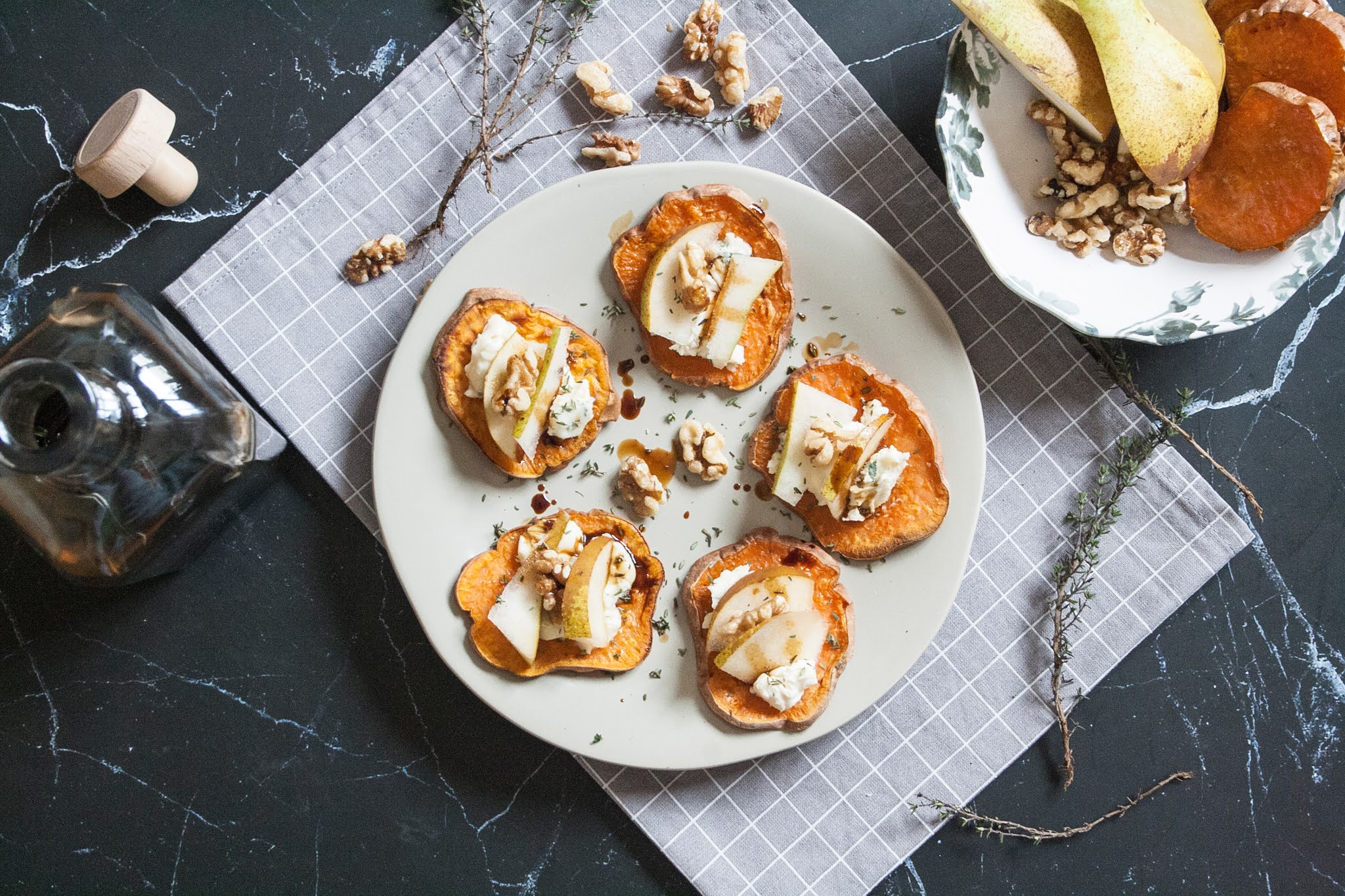 Procedimento per realizzare i crostini di patate dolci con formaggio, pere e aceto balsamico