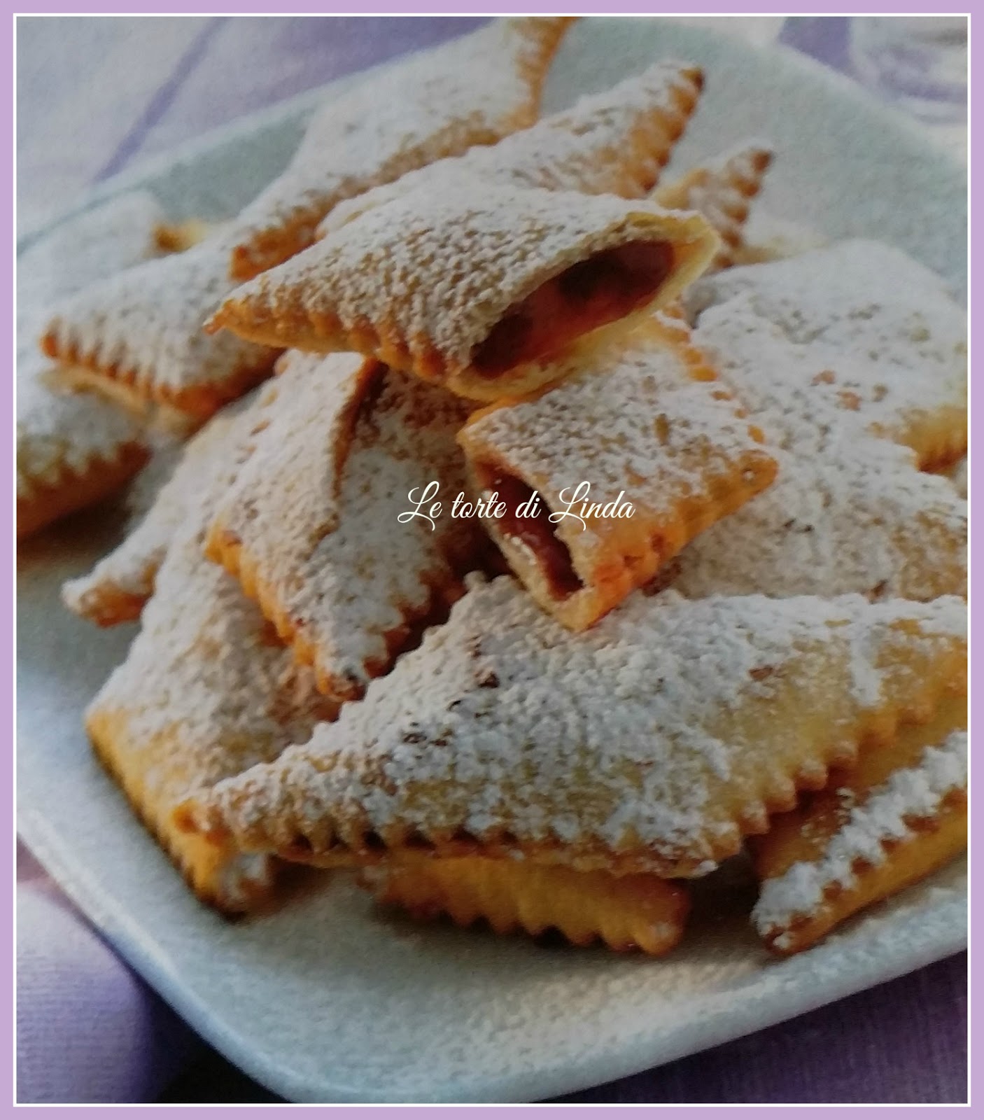 Stendete la pasta sottile e ritagliate tante strisce larghe 10-12 cm, spalmatele con un velo di confettura, piegatele a metà e dividetele a rombi con una rotellina dentellata.