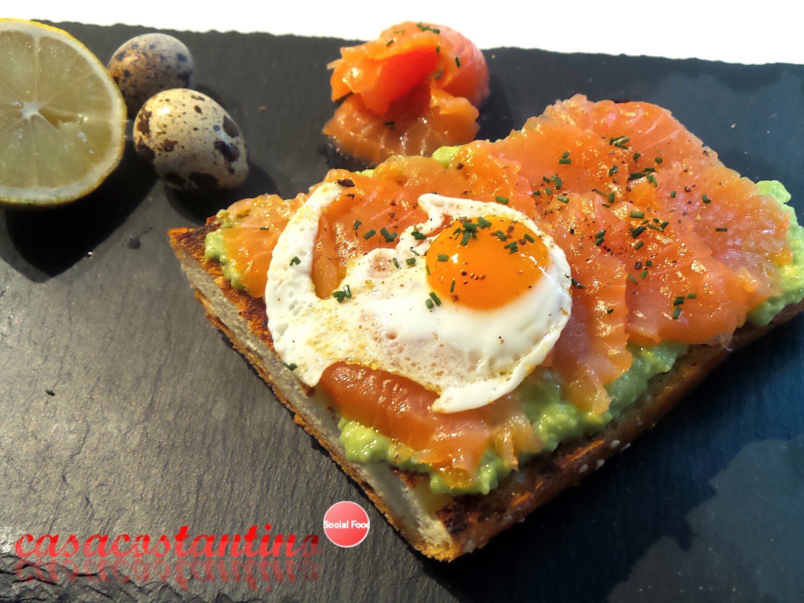 Su di un piatto d’ardesia adagiamo il crostone croccante, spalmiamoci sopra due cucchiai di crema di avocado, copriamo tutta la superficie con le fette di salmone e completiamo con l’uovo adagiato sul lato più largo del crostone. Finiamo con una macinata di pepe e dell’erba cipollina precedentemente tritata.