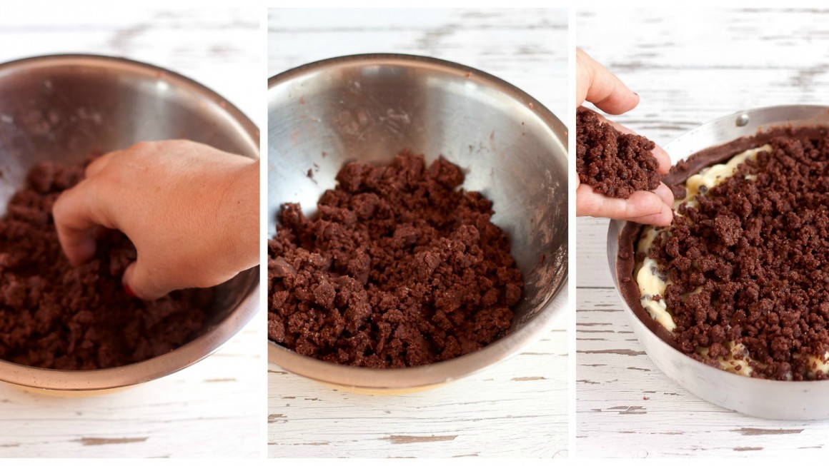 Versare la crema al cioccolato e di seguito la seconda parte della frolla, (quella con le mandorle) sempre con le mani, grossolanamente.