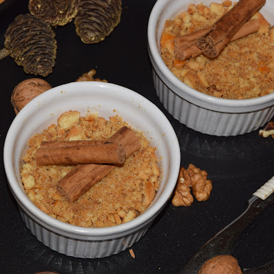 Riempite due cocottine con le mele e infine coprite con il crumble di biscotto.