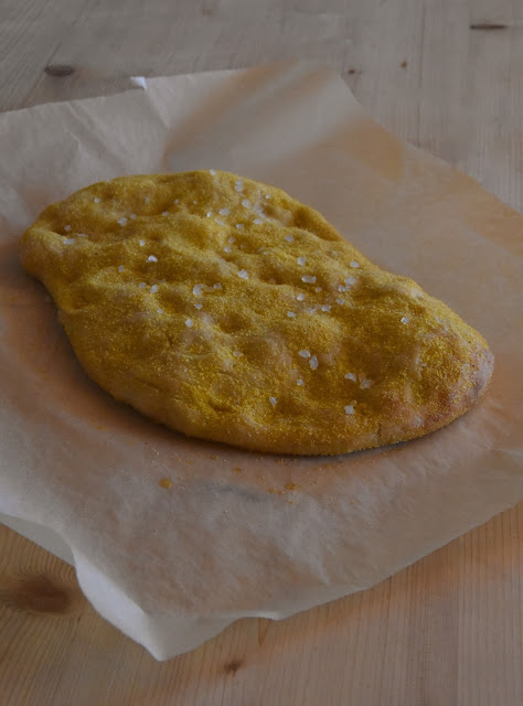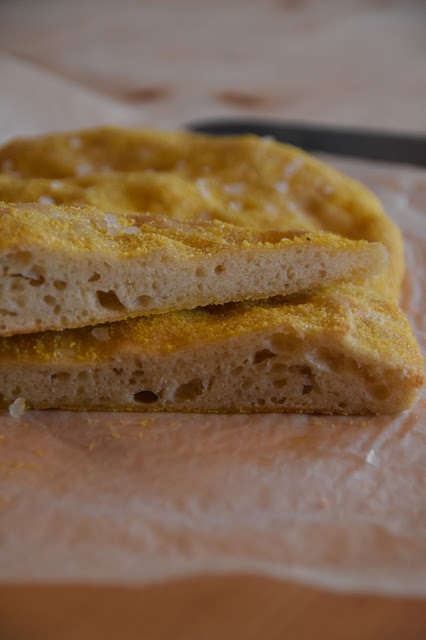 Capovolgiamo l’impasto sul piano di lavoro infarinato con farina di mais e stendiamolo delicatamente con i polpastrelli delle dita.