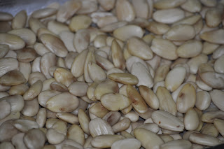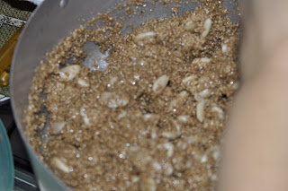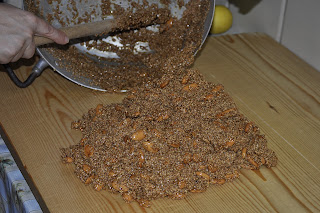 Quando il tutto bolle versare a piccole manciate il sesamo con le mandorle mescolando in continuazione. Qui comincia il bello: è tutto un girare lentamente, lentamente fino a quando, prendendo una mandorla e spaccandola a metà, avrà assunto un bel colore ramato: ci siamo!