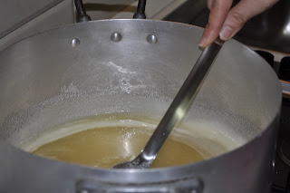 Si fanno sciogliere lo zucchero e il miele sul fuoco in una pentola d’alluminio.