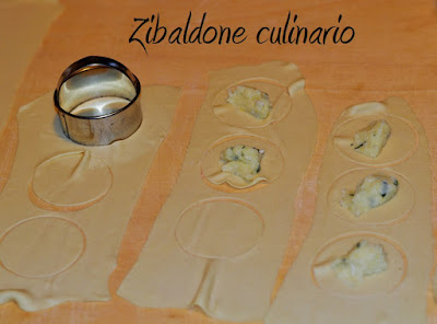 Stendere l’impasto con la sfogliatrice (penultimo foro) e con un coppapasta di 5-6 cm di diametro ricavare dei dischi.