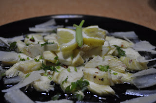 Questa insalatina dai sapori primaverili, può essere un fantastico antipasto: è semplicissima, delicata e veloce da preparare. Gli ingredienti sono: carciofi, limoni, prezzemolo, aglio, olio extravergine, peperoncino, scaglie di parmigiano.