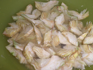 Tolgo tutte le foglie al carciofo, ripulisco i cuori dalla barba e taglio a fettine sottili. Li immergo in una soluzione di acqua e succo di limone per mantenerli bianchi.