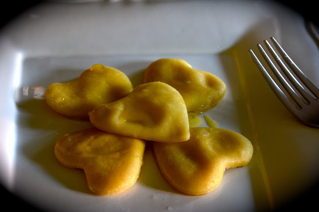 Ritagliate con il coltello o con una rotella tanti quadratini di pasta, sufficientemente grandi da contenere il coppapasta a forma di cuore avete a disposizione. Io ho usato una forma a cuore per biscotti di medie dimensioni, ma qui potete davvero sbizzarrirvi con le dimensioni. Se “coppate” bene e se avete fatto una bella sfoglia, i vostri ravioli non si apriranno durante la cottura. Nell’archivio del blog potete trovare molte forme bizzarre, anche ravioli a forma di Babbo Natale, molto più grandi di questi cuoricini, che vi posso assicurare non essersi mai rotti in cottura, né durante la composizione del piatto.