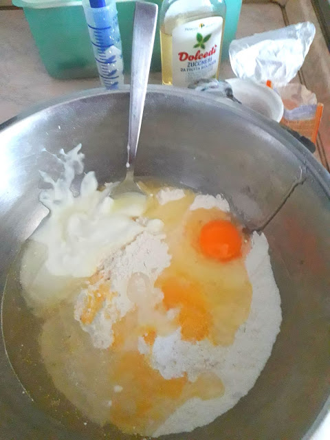 In una ciotola versare sulla farina tutti gli altri ingredienti ,mescolare e formare una palla
