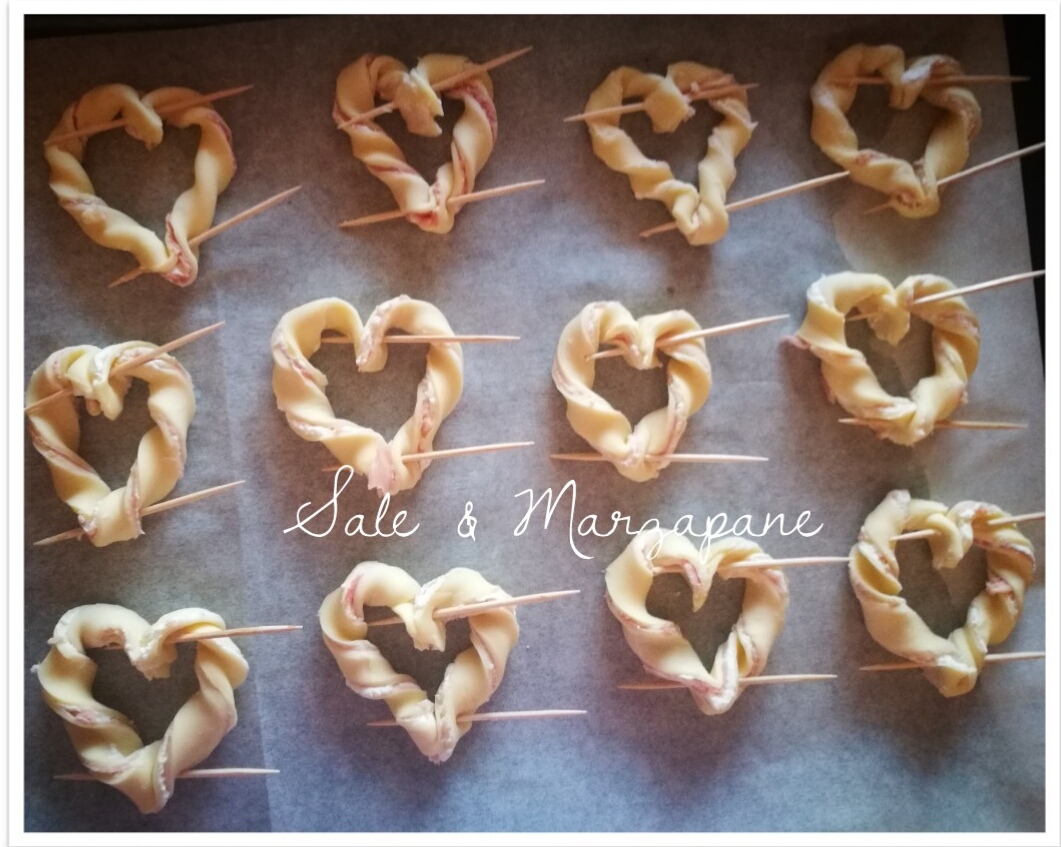 Eccola, si tratta di cuoricini di pasta sfoglia farciti con formaggio spalmabile ed affettati a scelta.
