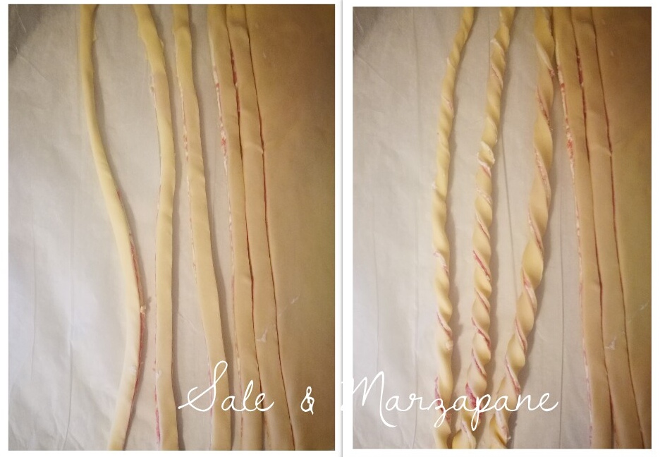Stendete leggermente la sfoglia aiutandovi con un matterello e ricavarne delle strisce di circa 2 cm. Arrotolate a spirale ogni striscia e richiudete la striscia a cuore.