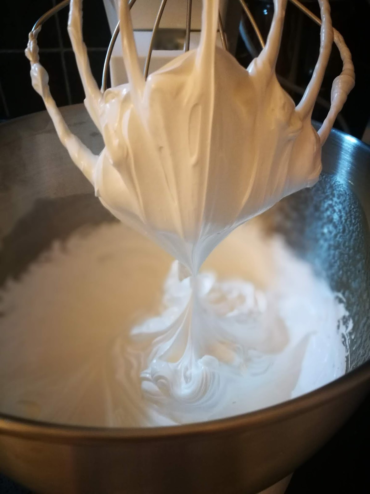 In una ciotola di metallo unire agli albumi lo zucchero ed il sale. Appoggiare la ciotola su una pentola nella quale bolle poca acqua in modo da creare un doppio bollitore, mescolare con una frusta a mano fino a quando tutto lo zucchero si sciolga bene ed il composto sia caldo toccandone una parte con le dita. Passare il tutto nell’apposito vano della planetaria partendo a velocità bassa e gradualmente incrementando ad alta, con la frusta a filo, montare il tutto fino a che si formino delle creste solide sulla superficie