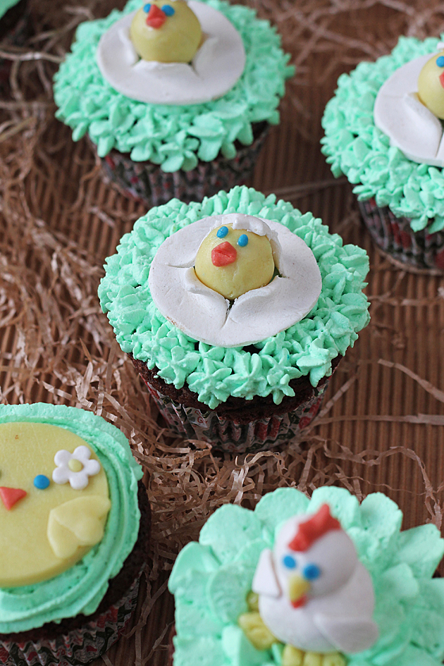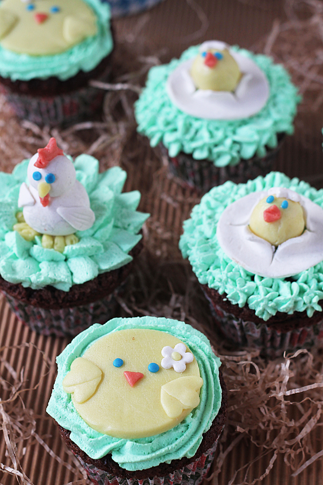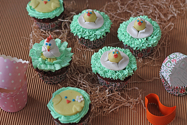 Con la pasta di zucchero modellate i pulcini e la gallinella e adagiateli sui cupcakes già glassati.