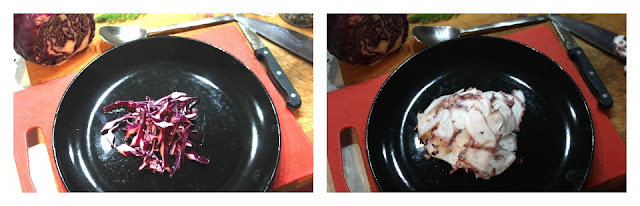 Il cavolo viola rimane nascosto finché non si inizia a tagliare, la croccantezza e il suo sapore intenso con il succo di limone, non coprono il polpo, ma ne esaltano la carne.
