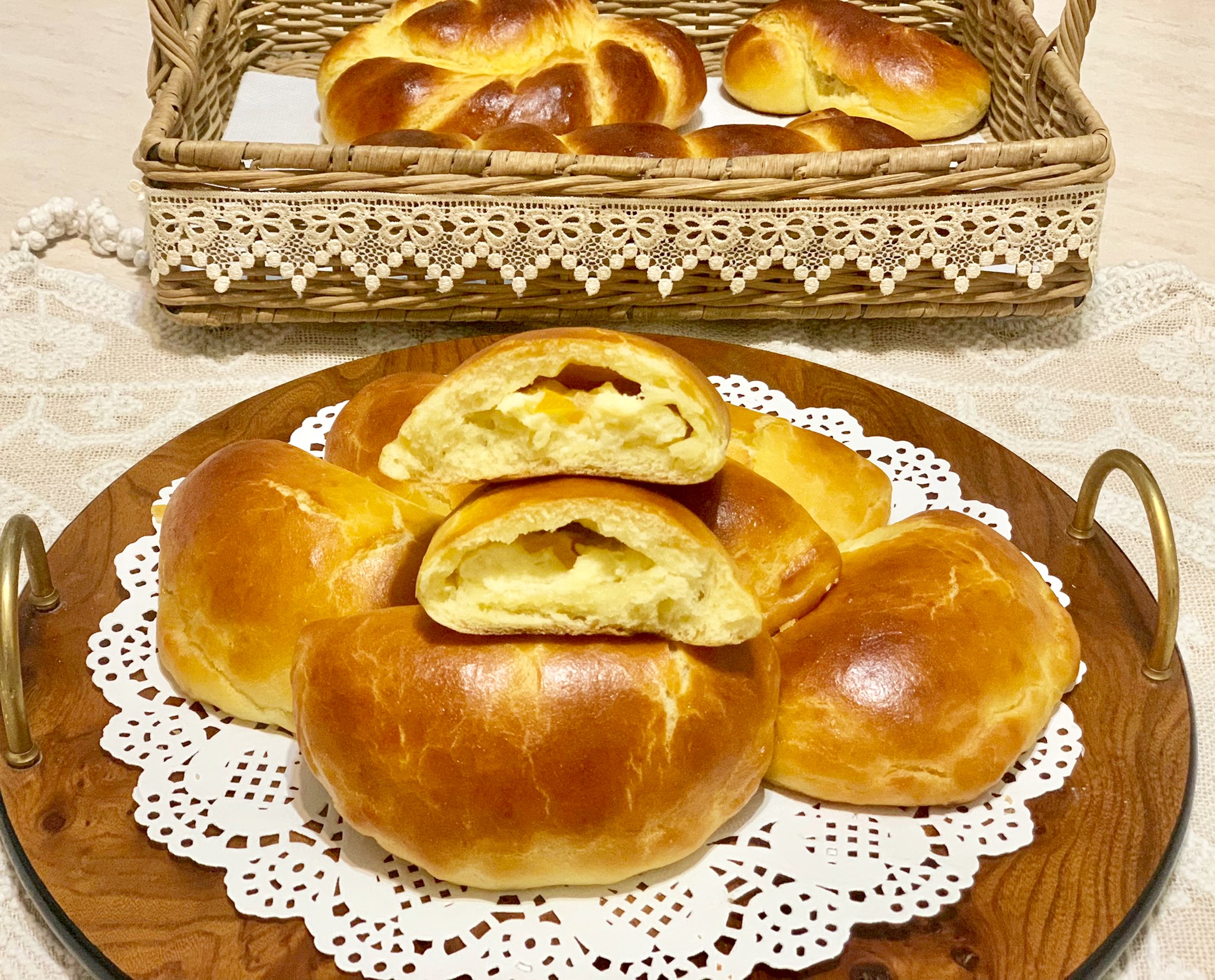 Quando l’impasto è lievitato adagiatelo sulla spianatoia e stendetelo con il mattarello. Con un coppapasta ricavate dei tondini (8/10 cm) e farciteli con un cucchiaio di crema e i cubetti di arancia candita o le gocce di cioccolato. Chiudeteli a mezzaluna e schiacciate bene i bordi.