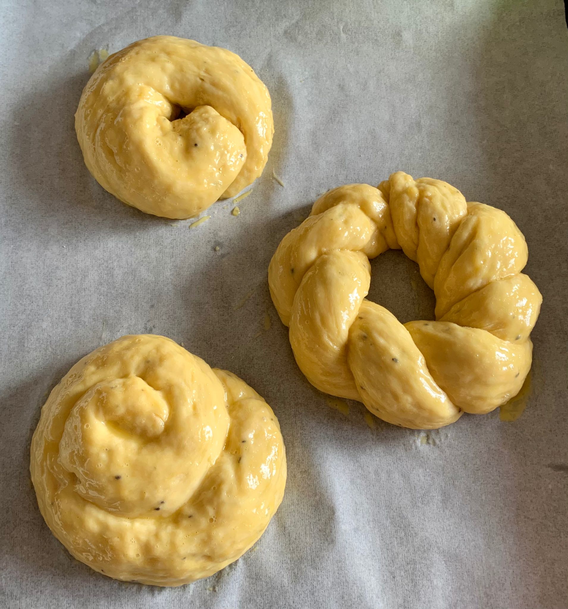 Una volta lievitate adagiatele sulle teglie rivestite con carta forno, spennellatele con l’uovo sbattuto e poi infornatele a 180° per 25 minuti circa.