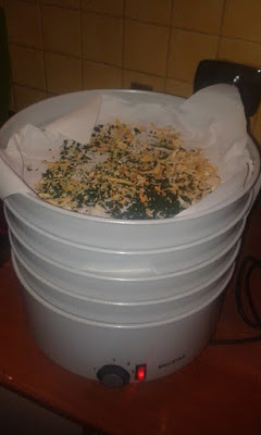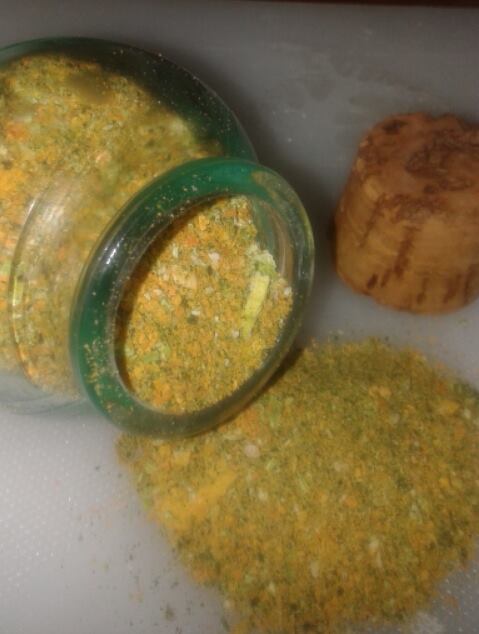 Quando le verdure sono tutte essiccate controllare i tempi perchè differenziano una dall’altra, frullare con un macinacaffè e distribuire in piccoli vasi di vetro, la polvere si conserva in credenza per qualche mese, se ne fate poco uso potete anche congelarla.