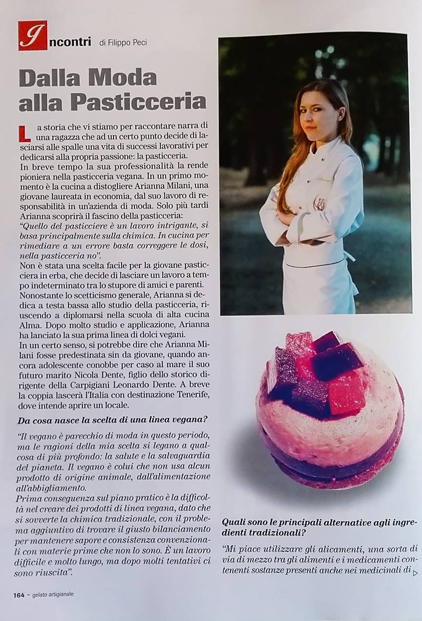 Con grande soddisfazione è uscito un articolo sulla rivista Gelato Artigianale di gennaio/febbraio 16 dove si parla di pasticceria vegana e di quello che per me rappresenta dal punto di vista della ricerca continua di prodotti sani, buoni e che “aiutino” il pianeta a vivere meglio.