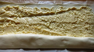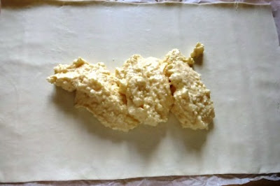Tirare un poco la pasta sfoglia e versare il composto..
