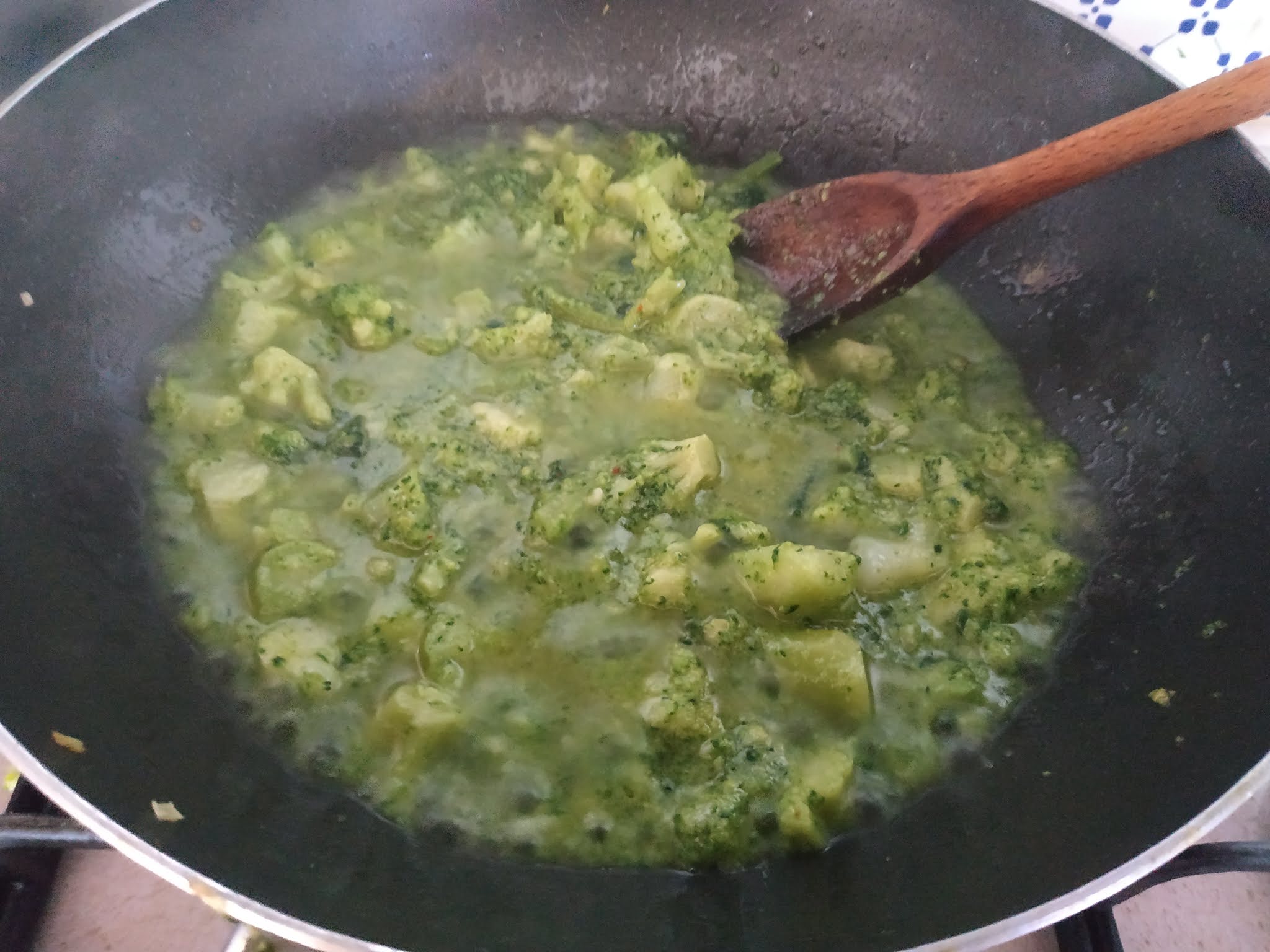Fate soffriggere in olio extravergine d’oliva con uno spicchio d’aglio e del peperoncino. Se necessario aggiungete un po’ d’acqua di cottura della pasta fin quando diventerà come una crema.