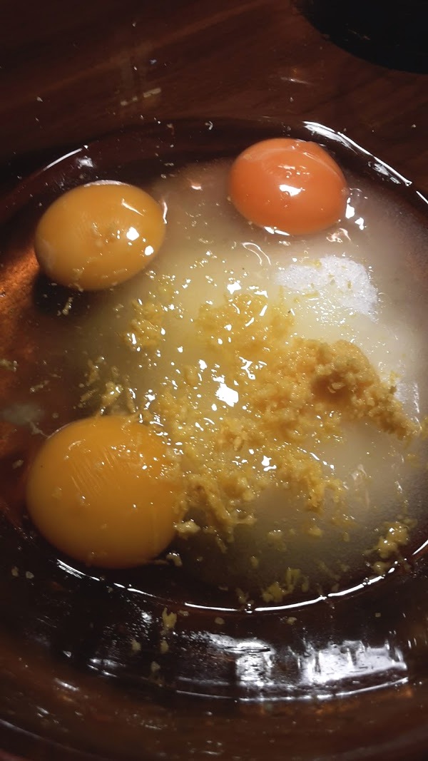 Sgusciare le uova in una grande terrina e aggiungere lo zucchero e la buccia grattugiata di un limone bio..