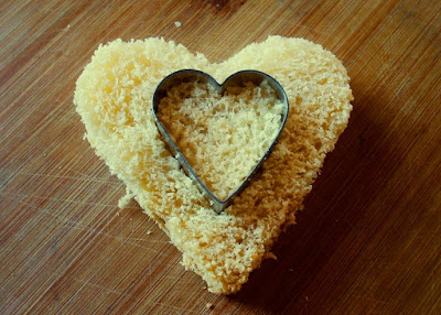 - Tagliare il Pan di Spagna, o nel mio caso, il pandoro in dischi alti circa 1,5 cm e con l’apposito stampino, ritagliare 16 cuori. Lasciare 8 di essi dentro gli stampini. Consiglio di appoggiare gli stampini sul piatto di un portatorta o qualcos’altro che abbia un coperchio.