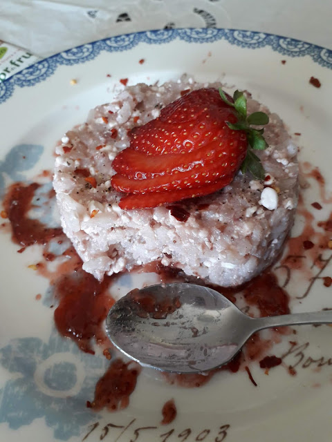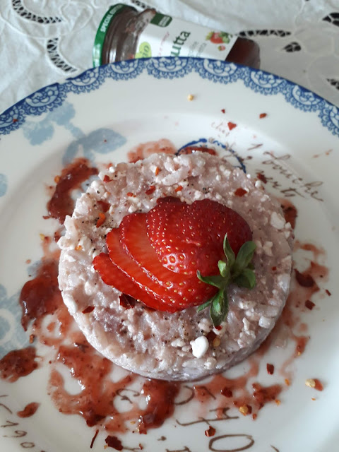 Togliere dal frigo,estrarre il coppapasta,guarnire con una fragola e un pizzico di peperoncino