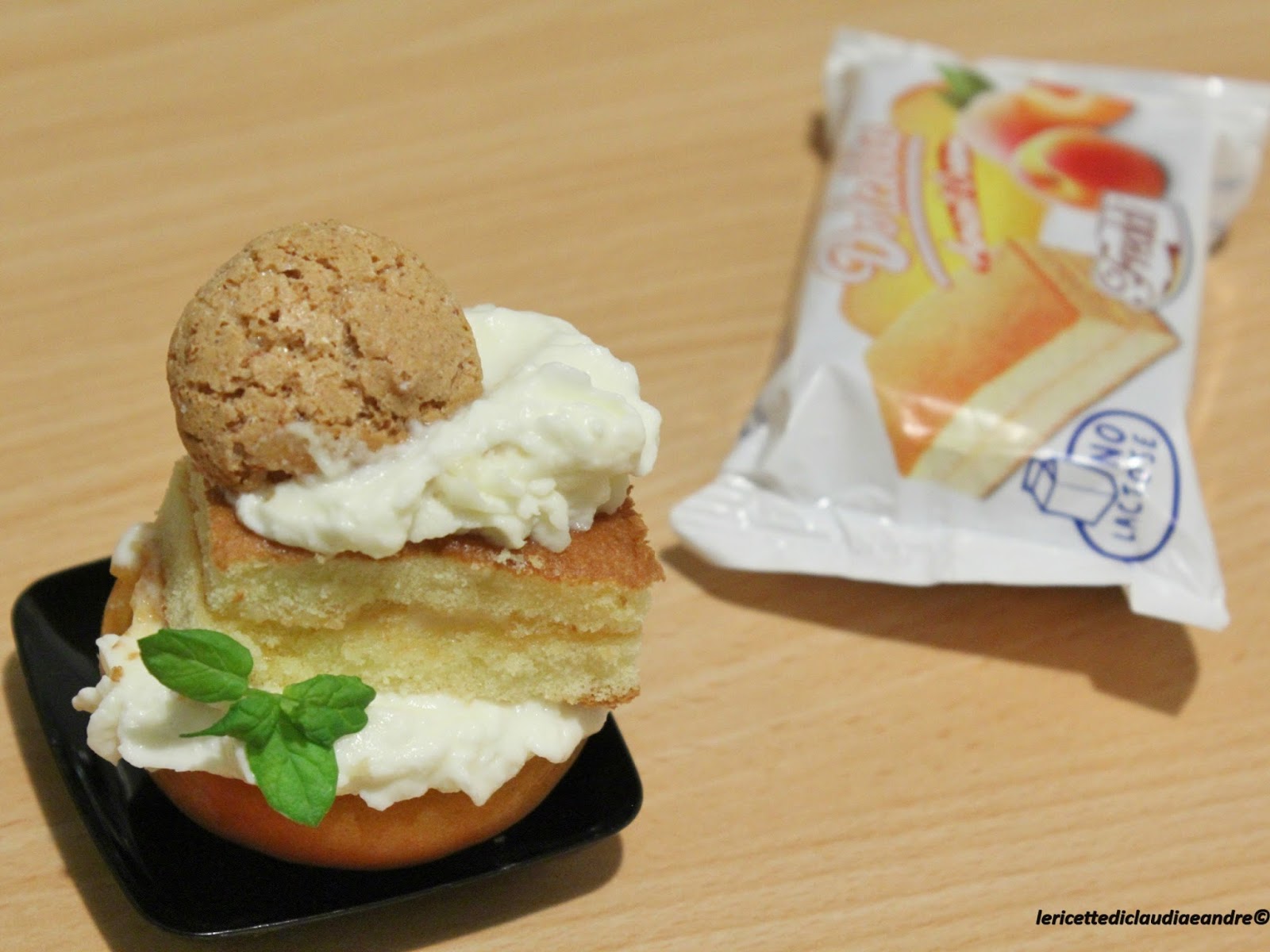 - Sistemare sopra un pezzo di merendina e decorare con un altro ciuffetto di crema e con un amaretto.