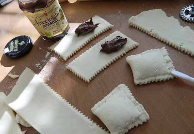ritagliare dei rettangoli e mettere al centro un cucchiaino colmo di Nocciolata,